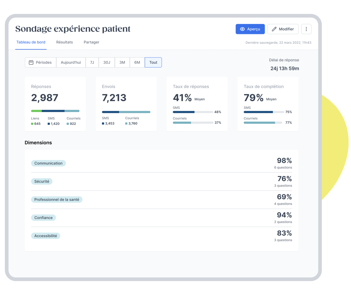 Accédez aux données de performances de vos questionnaires et aux réponses de vos répondants pour ajuster rapidement vos actions.
