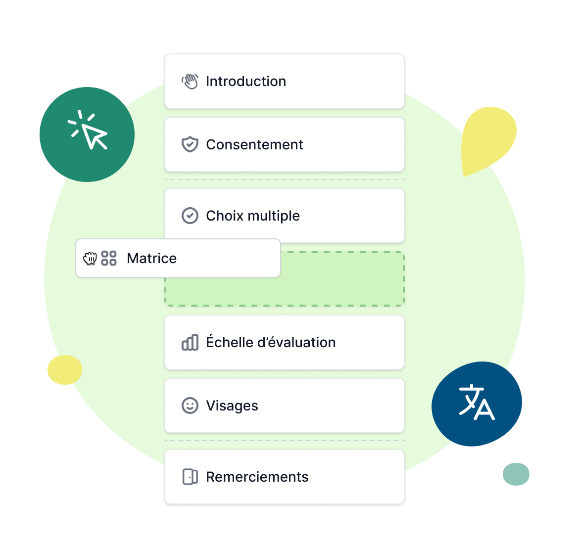 Ajoutez un consentement, des sections, des échelles de type Likert, des choix multiples, des questions ouvertes, des matrices et bien plus.